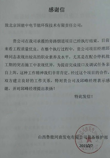 通過河曲EPC項(xiàng)目團(tuán)隊(duì)的共同努力,我司承攬的山西魯能河曲發(fā)電有限公司旁路煙道EPC項(xiàng)目,工程建設(shè)質(zhì)量優(yōu)良,并在項(xiàng)目執(zhí)行過程中,現(xiàn)場團(tuán)隊(duì)表現(xiàn)出較高的職業(yè)素養(yǎng)及水平,受到業(yè)主的一致贊譽(yù),同時也與業(yè)主建立了良好的合作關(guān)系。